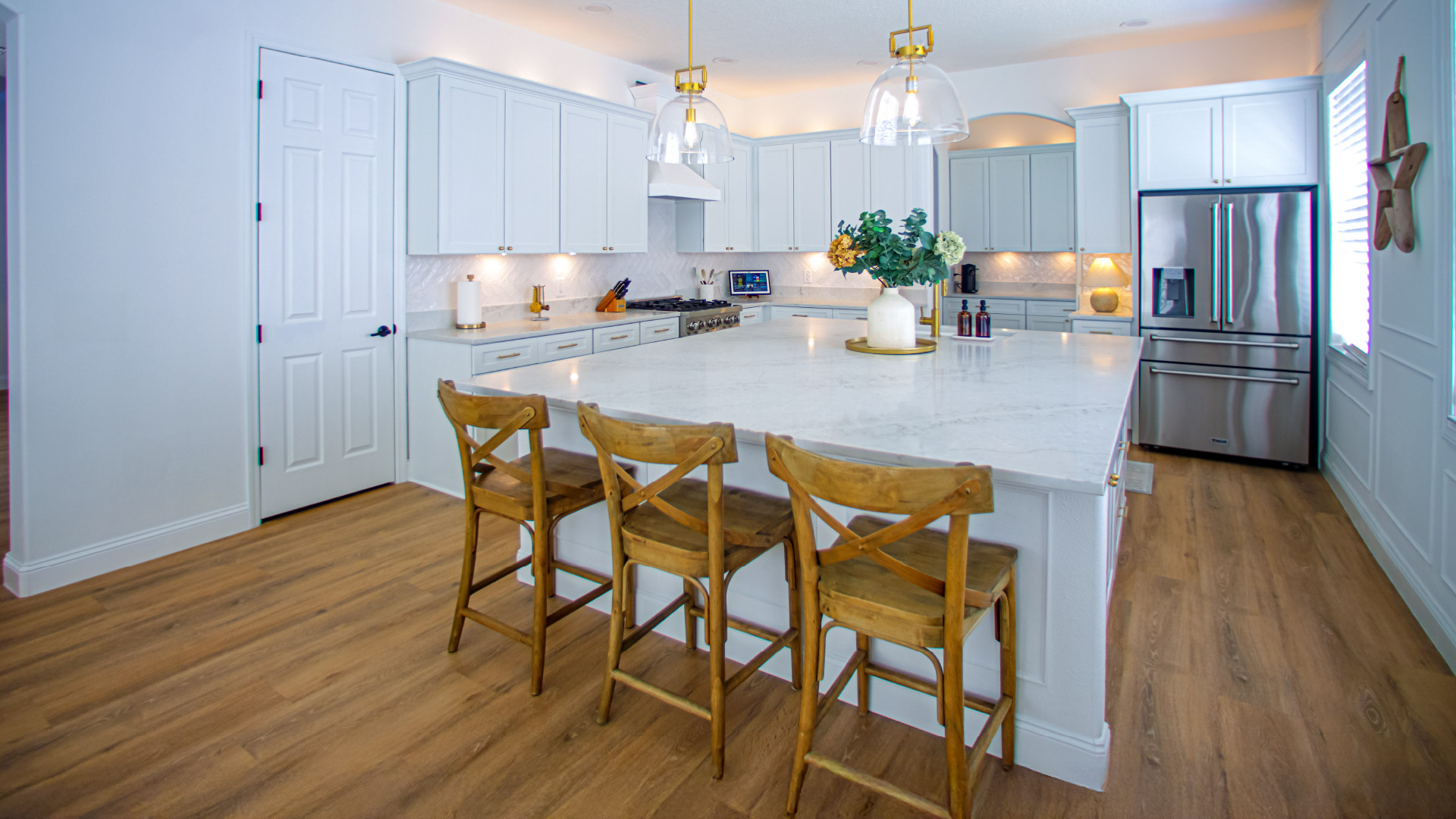 Walk through the door and the mood is immediate: soft light, pale wood, and an effortless sense of ease. White-washed floors stretch wide and welcoming. Sunlight glints off glass and warm gold finishes. In the kitchen there’s a 7-foot-by-9-foot island crowned with a luminous two-inch thick slab of marble that practically begs you to lean on it with a cup of coffee and a good story. Hand-laid herringbone tile adds quiet character. Washed oak, creamy cabinetry, and layered textures set a serene foundation, softened by the easy presence of real life — a backpack on a chair, toys not far from reach.